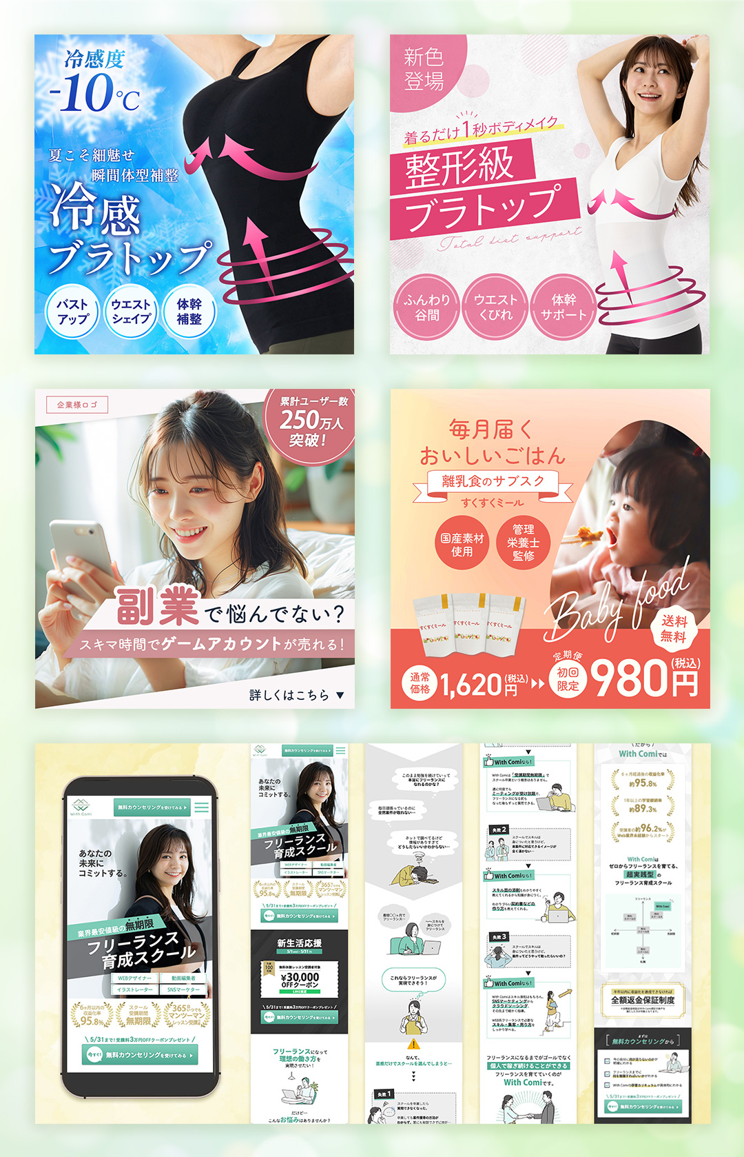 整体院/痩身サロン/女性用インナー/ゲーム/オンラインセミナー/Xヘッダー/フリーランス育成スクール/腰痛ベルト/キッズ無料撮影会/ブログアイキャッチ/ダイエットサプリ/レディースバッグ
